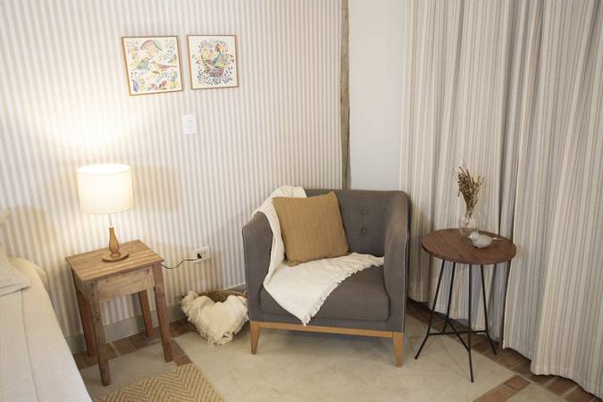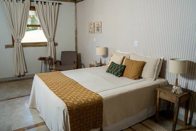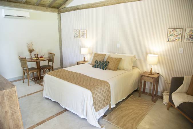 A Cabana Dupla pode ser configurada com uma cama de casal ou duas camas de solteiro. Possue 30m2 e varanda com vista para o jardim, além de Amenities L’Occitane au Brésil, Enxoval 300 Fios e Toalhas Trousseau.