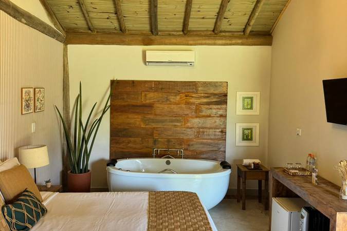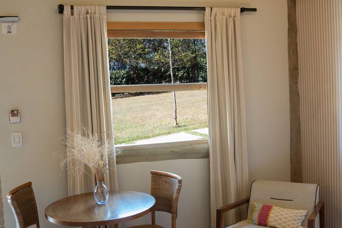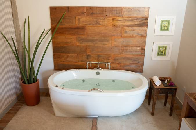 A Cabana Dupla com Hidro pode ser configurada com uma cama de casal ou duas camas de solteiro. Possui 30m2 e varanda com vista para o jardim. Amenities L’Occitane au Brésil, Enxoval 300 Fios e Toalhas Trousseau.