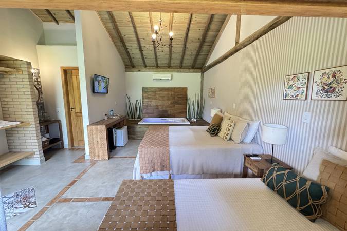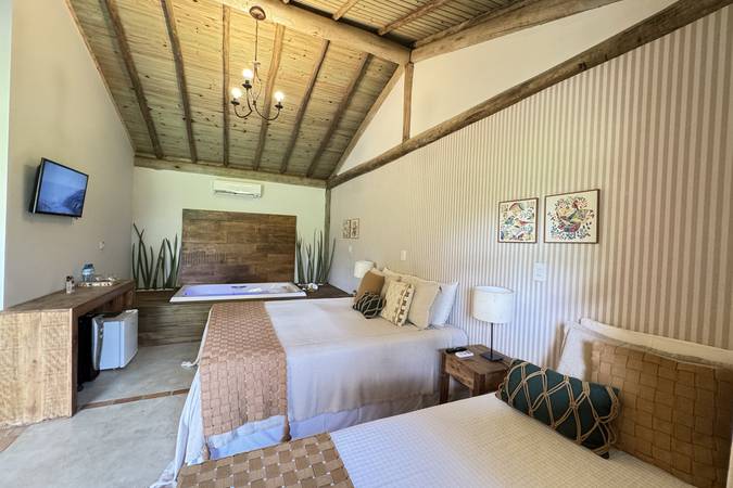 A Cabana Tripla com Hidro com jatos turbo pode ser configurada com uma cama de casal e uma de solteiro ou três camas de solteiro. Possue 30m2 e varanda com vista para o jardim. Amenities L’Occitane au Brésil, Enxoval 300 Fios e Toalhas Trousseau.