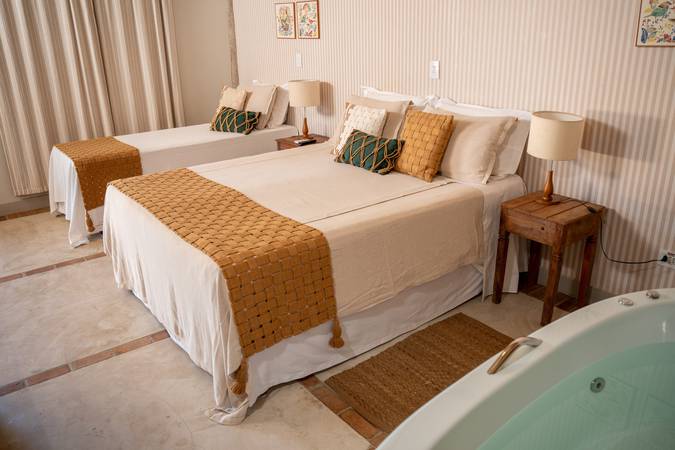 A Cabana Tripla com hidro pode ser configurada com uma cama de casal e uma de solteiro ou três camas de solteiro. Possue 30m2 e varanda com vista para o jardim. Enxoval 300 Fios e Toalhas Trousseau. Amenities L’Occitane au Brésil.