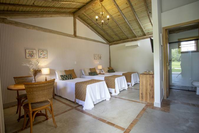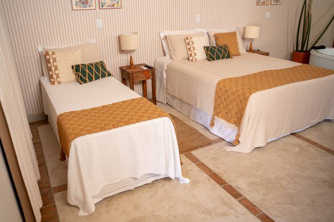 A Cabana Tripla pode ser configurada com uma cama de casal e uma de solteiro ou três camas de solteiro. Possue 30m2 e varanda com vista para o jardim. Amenities L’Occitane au Brésil, Enxoval 300 Fios e Toalhas Trousseau.