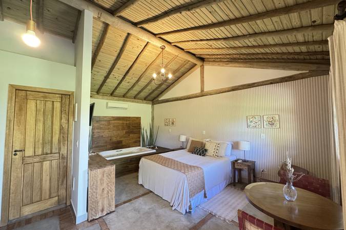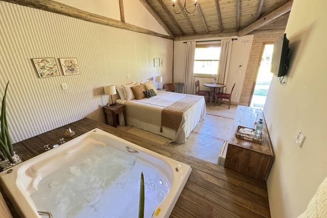 A Cabana Dupla com Hidro Luxo pode ser configurada com uma cama de casal ou duas camas de solteiro. Possui 30m2 e varanda com vista para o jardim, Enxoval 300 Fios e Toalhas Trousseau e Amenities L’Occitane au Brésil.