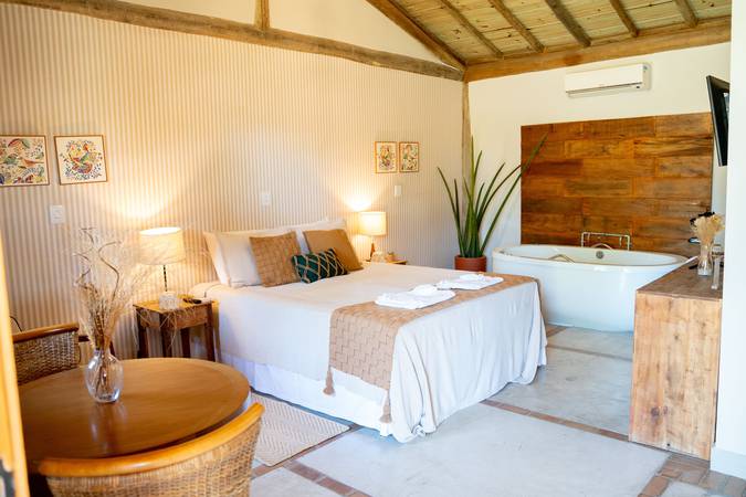 A Cabana Dupla com Hidro pode ser configurada com uma cama de casal ou duas camas de solteiro. Possui 30m2 e varanda com vista para o jardim. Amenities L’Occitane au Brésil, Enxoval 300 Fios e Toalhas Trousseau.