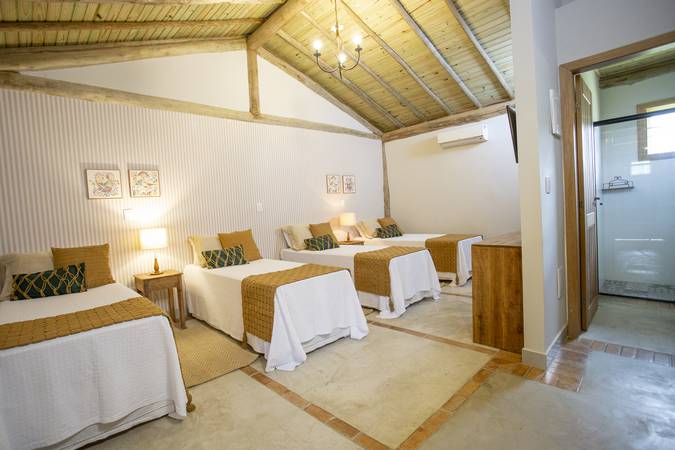 A Cabana Quádrupla pode ser configurada com uma cama de casal e duas de solteiro ou quatro camas de solteiro. Possue 30m2 e varanda com vista para o jardim. Amenities L’Occitane au Brésil, Enxoval 300 Fios e Toalhas Trousseau.
