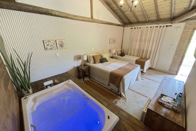 A Cabana Tripla com Hidro com jatos turbo pode ser configurada com uma cama de casal e uma de solteiro ou três camas de solteiro. Possue 30m2 e varanda com vista para o jardim. Amenities L’Occitane au Brésil, Enxoval 300 Fios e Toalhas Trousseau.